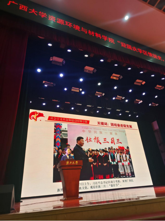 在大礼堂开展“金色年华·党在资环材——迎国庆学区情国史,跟党走立报国壮志”主题报告会,报告会邀请了广西革命纪念馆的讲解员围绕广西新民主主义革命时期历史、社会主义革命和建设时期历史两个专题宣讲。学院党委书记沈大强、副书记吴达慧与师生党员代表及2021级全体新生共同参加了报告会。