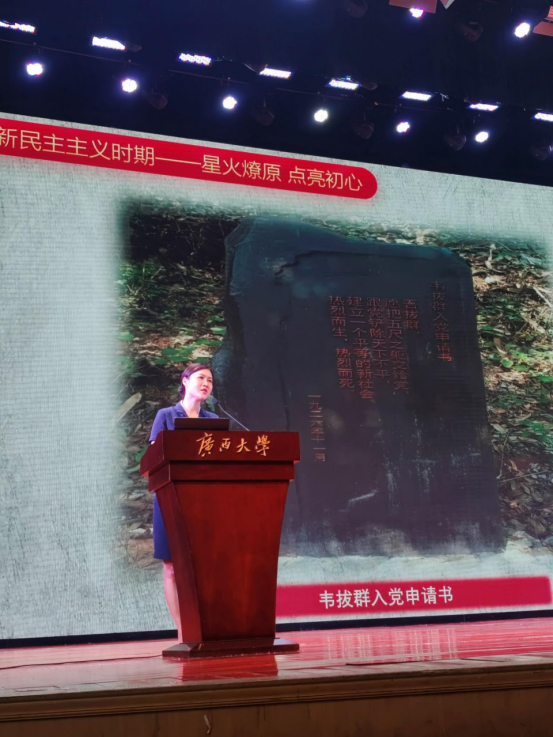 报告会近两个小时的时间,从多年来广西革命纪念馆馆藏的珍贵文物、历史史料背后的故事作为切入点,带领大家追忆时代背景,盘点时代印记,提炼时代精神,通过以小见大的方式,和大家一起重温从1840年鸦片战争至社会主义新中国成立的新民主主义革命时期、从新中国建立到改革开放前的社会主义革命和建设时期的党史、广西革命史中的感人事迹,带大家回到那个救亡图存苦求索、革命理想高于天的年代,回到那个硝烟弥漫、战火纷飞的年代,回到那个热情似火、激情燃烧的年代,共同感悟革命精神,增强历史自觉,筑牢信仰之基,让大家深刻认识到红色政权来之不易、新中国建立发展来之不易。