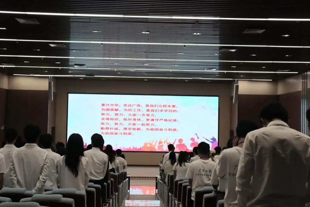 最后,学生会主席团成员覃彬烘带领全体团学组织成员宣誓,在全体成员合唱校歌后,污污漫