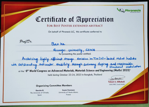 院长邹炳锁教授等一行4人应邀出席,其中邹炳锁教授做了题为“Excitation and Optical Properties of Diluted Magnetic Semiconductor Nanostructures”的邀请报告。博士研究生科宝展示的墙报“Achieving Highly Efficient Orange Emission in Tin (IV)-based Metal Halides with Outstanding Anti-water Stability through Antimony Doping and Reasonable Structural Modulation”获最佳墙报奖。