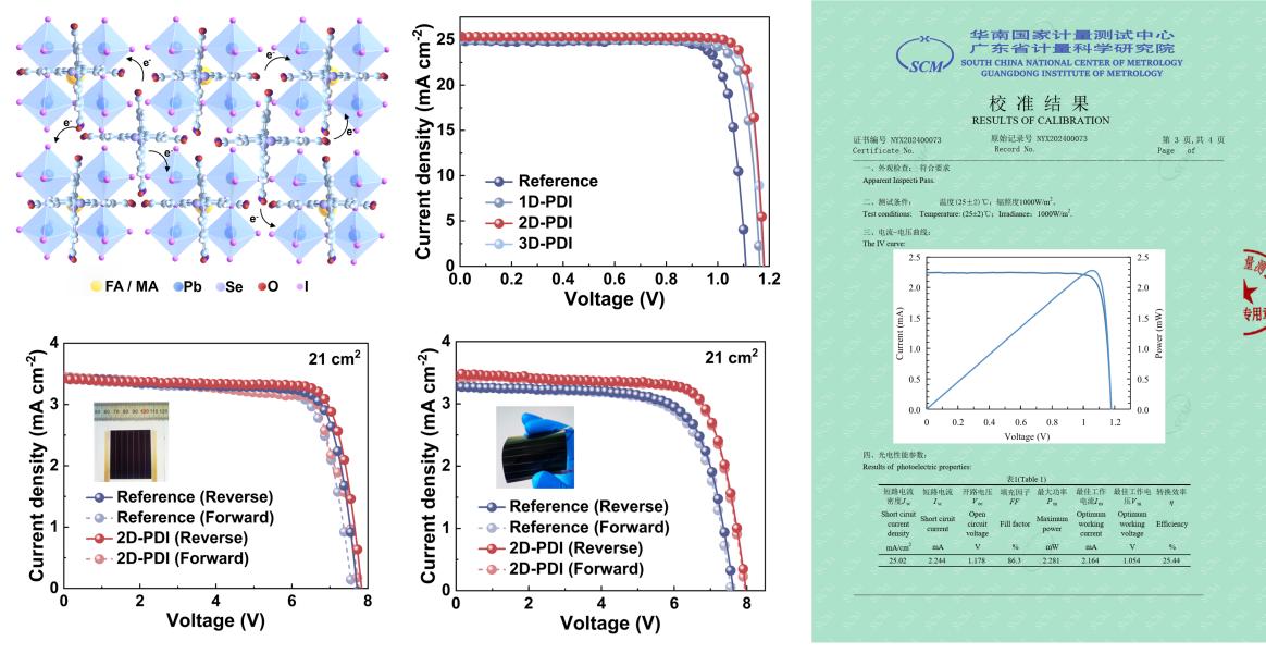 新型的卤化物半导体钙钛矿太阳电池(PSCs)凭借其低成本、可溶液加工和优异的光电性能等优势而迅速发展起来,越来越无限接近市场。然而,反式(p-i-n)PSCs仍存在相对较大的开路电压(VOC)损耗,这主要是由于强极性钙钛矿薄膜或界面上存在严重的非辐射复合,以及弱n型钙钛矿特性所导致的非平衡电荷传输所致。本文中研究团队设计了三种不同维度的基于苝二酰亚胺(PDI)的有机小分子,包括1D-PDI、2D-PDI和3D-PDI,以此作为掺杂剂制备n型钙钛矿薄膜。含有硒(Se)的PDI分子具有很强的给电子能力,能有效地扩大钙钛矿内部的准费米能级裂分(QFLS),抑制快速非辐射弛豫。此外,PDI分子还能通过共轭骨架包覆在钙钛矿表面形成“晶格笼”,从而钝化本体缺陷,减少局域陷阱,提高n型掺杂效率以及钙钛矿器件的稳定性。加入2D-PDI后,小面积太阳电池的能量转换效率(PCE)达到了26.06%(认证效率为25.44%),VOC为1.18 V,填充因子高达87.23%。刚性和柔性钙钛矿太阳电池模组也分别实现了21.48%和20.71%的PCE(孔径面积为21 cm2)。 这一新发现证明了这种维度调控策略能有效设计n型掺杂和制备高性能反式钙钛矿太阳电池,为未来技术应用提供了新思路。