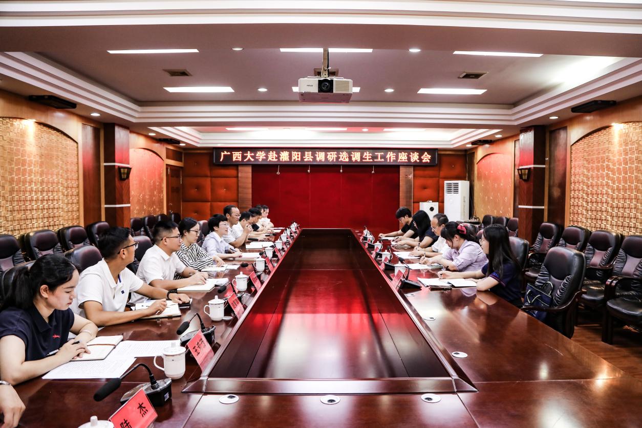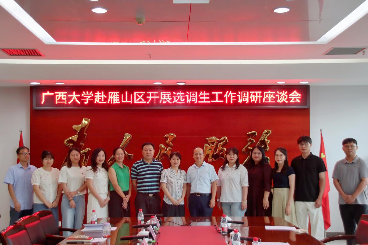 7月28日至29日,受学校委托,学院党委书记沈大强带队赴桂林市雁山区和灌阳县调研选调生工作,并在两地分别召开选调生代表座谈会。雁山区委常委、组织部部长莫运珍、组织部副部长吴俊富,灌阳县委常委、组织部部长舒满江、组织部常务副部长蒋红富和相关选调生校友参加座谈会。
