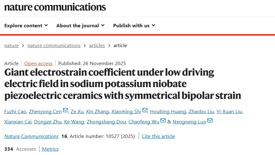 科研团队研发出具备超低驱动电场和巨应变系数的铌酸钾钠无铅压电材料,性能超越当前主流的铅基压电体系,在高精度微型器件应用领域上展现出巨大的潜力。该成果以 “Giant electrostrain coefficient under low driving electric field in sodium potassium niobate piezoelectric ceramics with symmetrical bipolar strain”为题,发表在国际知名期刊《自然·通讯》(Nature Communications, 2025, 16, 10527.)上。污污漫