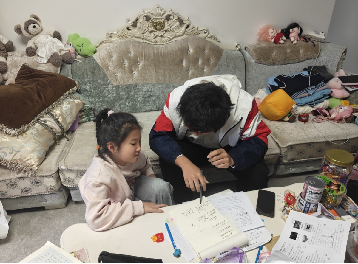刚接触小杰时,他的英语成绩仅徘徊在50分左右,基础薄弱,学习信心明显不足。负责帮扶他的志愿者郝婧敏与刘博并未急于求成,而是从建立信任与陪伴开始。每次辅导结束后,两位志愿者都会与小杰促膝谈心,倾听他分享校园生活中的点滴、成长中的烦恼,以及对自己未来的憧憬与规划。“我们一般会和他聊聊天,听他讲讲学校的事。”志愿者回忆道。正是这份真诚的倾听,让她们走进了孩子的内心世界,也找到了精准施教的切入点。