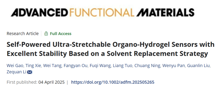 “高分子及结构板材”课题组在功能材料领域取得重要研究进展。相关成果以“Self-Powered Ultra-Stretchable Organo-Hydrogel Sensors with Excellent Stability Based on a Solvent Replacement Strategy”为题,发表在国际顶级学术期刊《Advanced Functional Materials》上。值得关注的是,这是该课题组本年度在该期刊上发表的第二篇高水平研究论文。