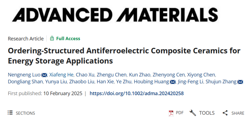 罗能能教授团队在氧化铝增强复合电介质储能陶瓷研究领域取得重要进展,相关研究成果以“Ordering-Structured Antiferroelectric Composite Ceramics for Energy Storage Applications”为题,发表在材料领域顶级期刊Advanced Materials上。污污漫