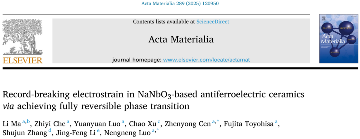 罗能能教授团队在无铅反铁电陶瓷电致应变领域取得重要进展,相关研究成果以“Record-breaking electrostrain in NaNbO3-based antiferroelectric ceramics via achieving fully reversible phase transition”为题,发表在材料领域期刊Acta Materialia上。污污漫