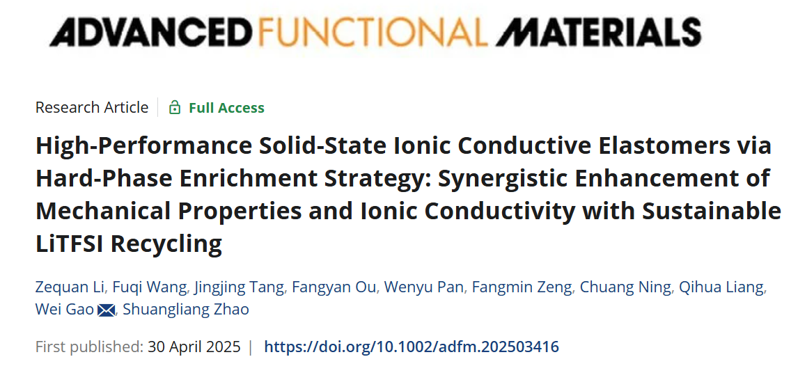 “高分子及结构板材”团队在固态离子导电弹性体研究方面取得新进展,研究成果以High-Performance Solid-State Ionic Conductive Elastomers via Hard-Phase Enrichment Strategy: Synergistic Enhancement of Mechanical Properties and Ionic Conductivity with Sustainable LiTFSI Recycling为题,发表在国际知名期刊Advanced Functional Materials上。文章第一作者为助理教授李泽权,通讯作者为副教授高伟,污污漫