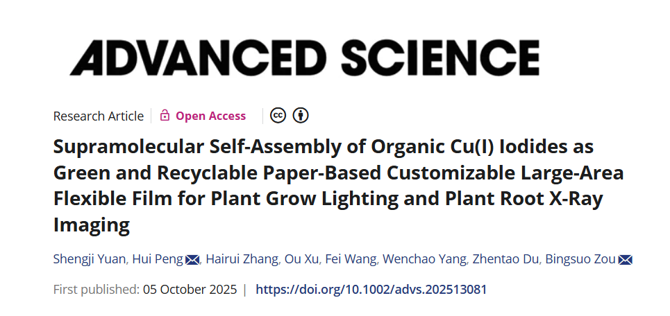 该团队通过超分子自组装策略,成功开发出一种基于滤纸和有机铜碘化物的可定制、大面积、可回收、可生物降解的柔性发光薄膜,并成功构建了一个集植物生长照明与植物根部X射线成像于一体的双功能平台。该研究成果以题为《Supramolecular Self-Assembly of Organic Cu(I) Iodides as Green and Recyclable Paper-Based Customizable Large-Area Flexible Film for Plant Grow Lighting and Plant Root X-Ray Imaging》发表于国际顶级学术期刊《Advanced Science》(IF = 14.1),彭辉博士和邹炳锁教授为共同通讯作者,硕士研究生袁升记为第一作者。污污漫