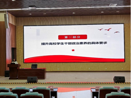 梁钰姗同学首先强调政治素养是青年学生成长成才所需具备的基本素质,指出当前部分学生骨干存在政治学习不够深、理论水平不够高、联系社会不够紧等问题。她以“学生干部政治素养提升”为题,向现场同学讲述提升政治素质、强化责任担当的方法举措:一是深入学习党规党章,知行合一,提高理论素养;二是严守底线红线,正风肃纪,强化纪律素养;三是保持健康行为习惯,严以修身,滋润道德素养;四是注重课内外积累,融会贯通,丰富文化素养;五是构建良好人际关系,礼尚往来,巩固心理素养。