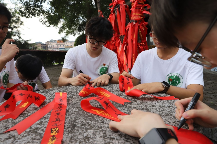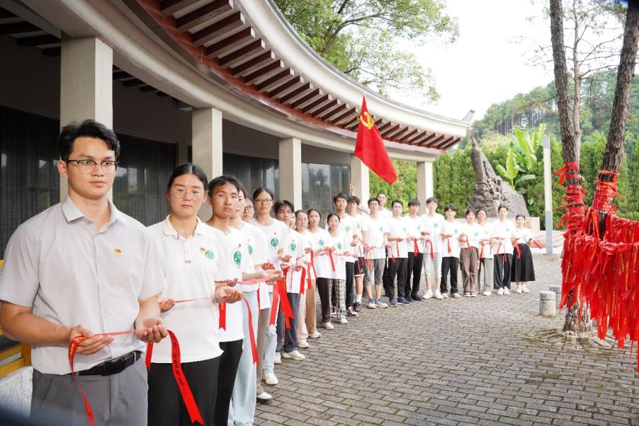 宣讲团师生为革命先烈系红飘带
