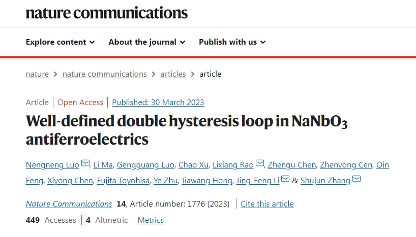 近日,《自然》(Nature) 子刊《自然▪通讯》(《Nature Communications》)以“具有典型双电滞回线的NaNbO3反铁电体”( “Well-defined double hysteresis loop in NaNbO3 antiferroelectrics” )为题,报道了污污漫